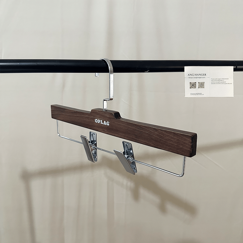 Our Custom Walnut Wood pant hangers blend premium texture with practical functionality: crafted from solid walnut (a rich, deep wood tone), they feature polished metal clips and a reinforced crossbar that securely grip pants, trousers, or jeans without slipping or damaging fabrics. Ideal for boutique garment displays, these pant hangers support high-frequency use while maintaining a sleek, upscale look. Branded logo engraving (matching the photo’s embedded design) is available to align with your store’s identity, and the sturdy build facilitates easy bulk stacking for retail inventory. Elevate your display with these durable, custom walnut hangers—contact us for wholesale quotes!